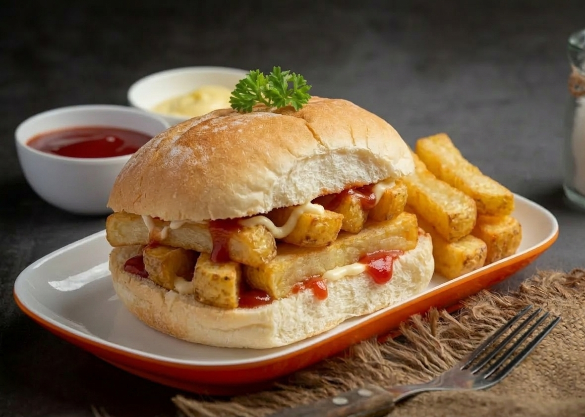 Classic chip butty – hot chips stuffed inside a soft buttered bread roll.